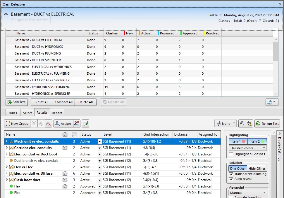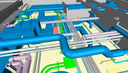 We host weekly online coordination meetings for BIM projects, involving all the trades. Once all trades have submitted their models for a floor, our first objective is to look at all the clashes as a global view and resolve the main runs clashes, while keeping all trades as flat as possible. We want to ensure that the largest duct and pipes can cross over each other while fitting within the ceiling space available.